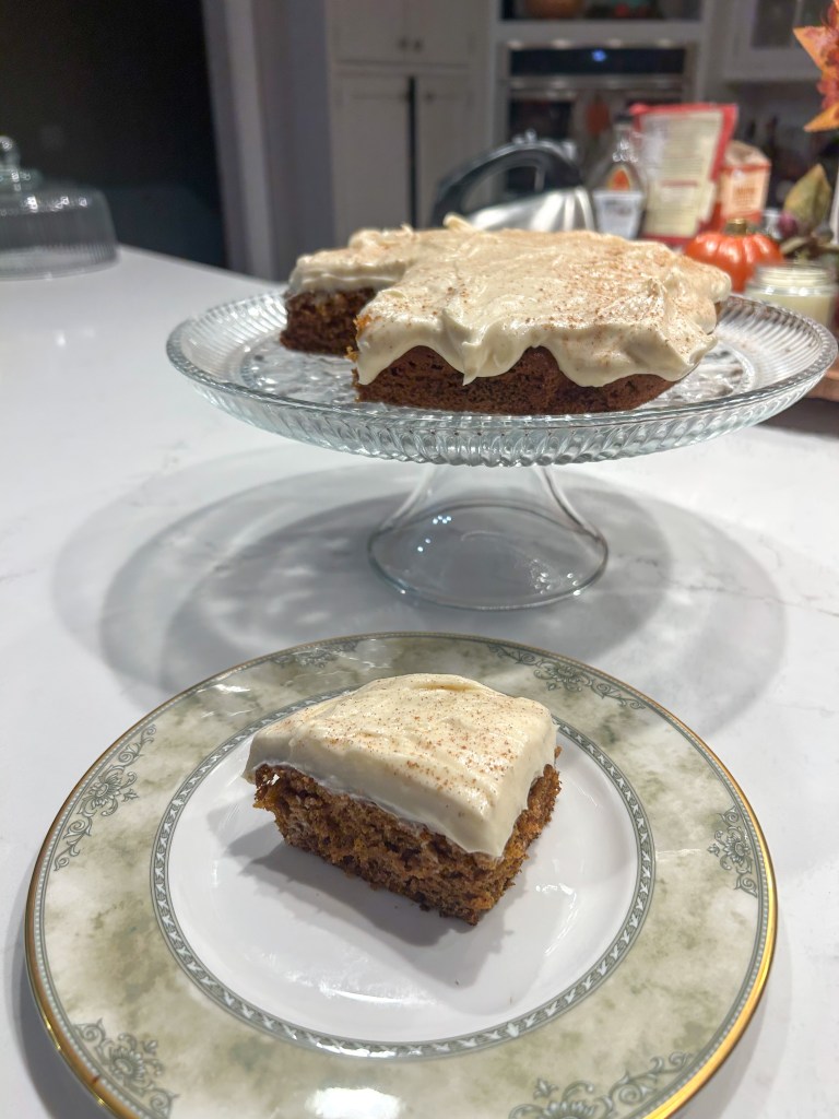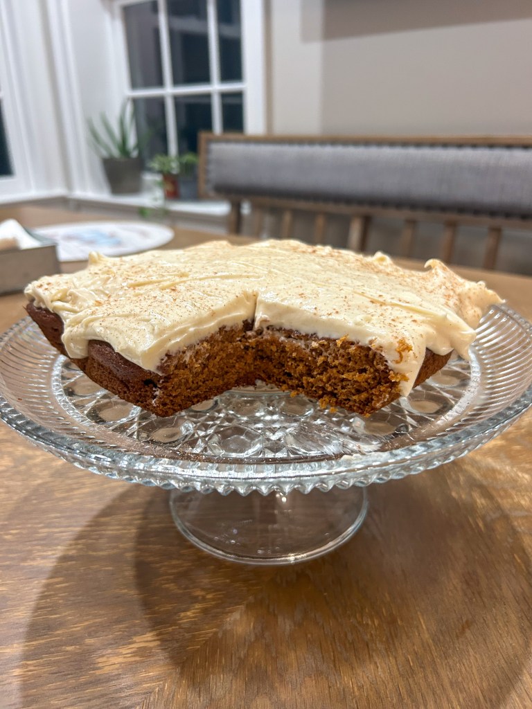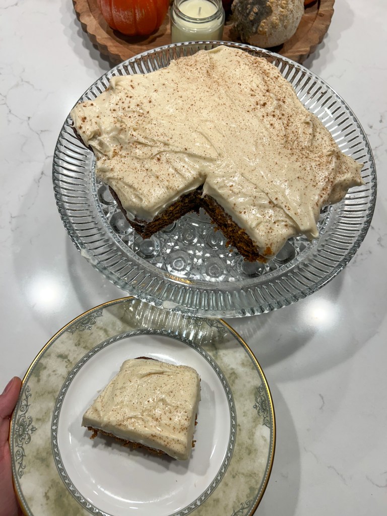 - Once the cake is fully cooled, frost generously, sprinkle a little cinnamon on top if you’d like, and serve.